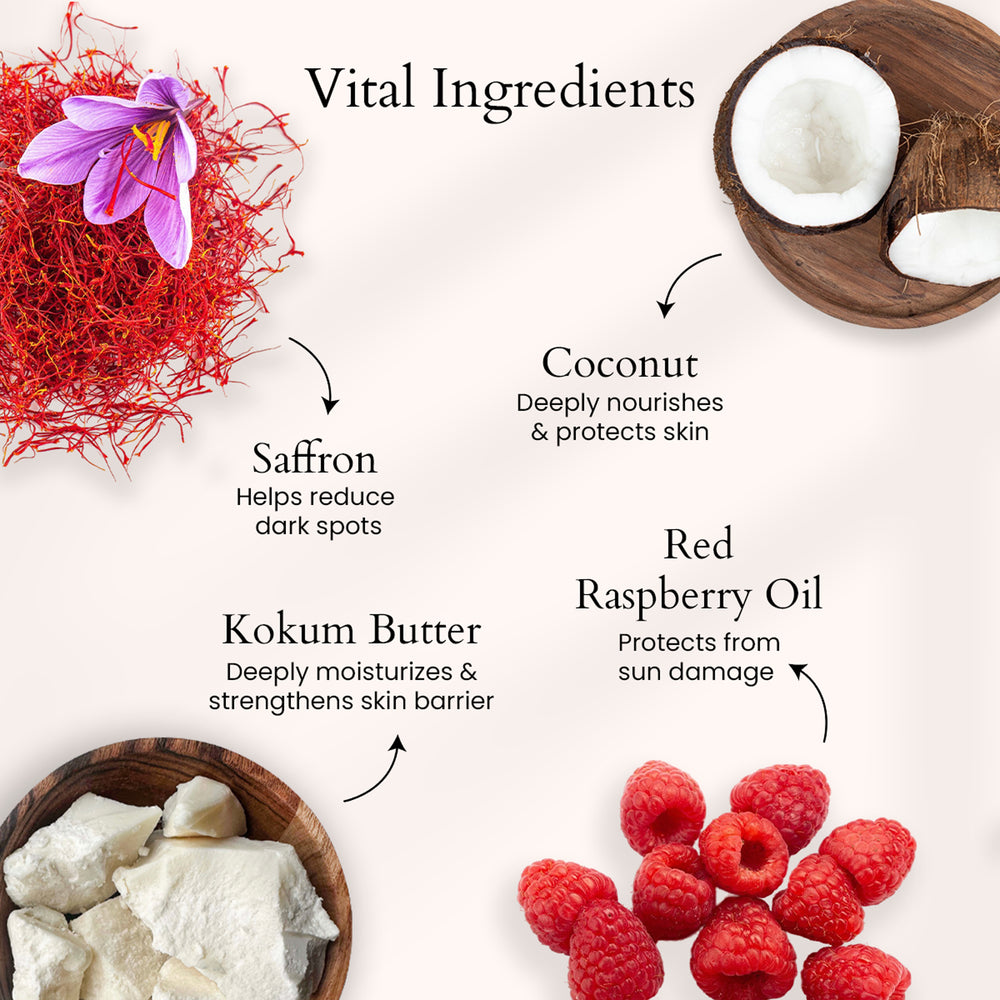 The Kumkumadi Nourishing Day Cream is your daily moisturiser for a soft, bright, calm-looking face. It helps with dullness, dark spots, and early signs of aging while adding a comfortable, non-greasy glow. With Kumkumadi oil and skin-loving butters and oils, it keeps your skin hydrated through the day and supports an even tone. Think smooth texture, less dryness, and a healthier finish you can see.